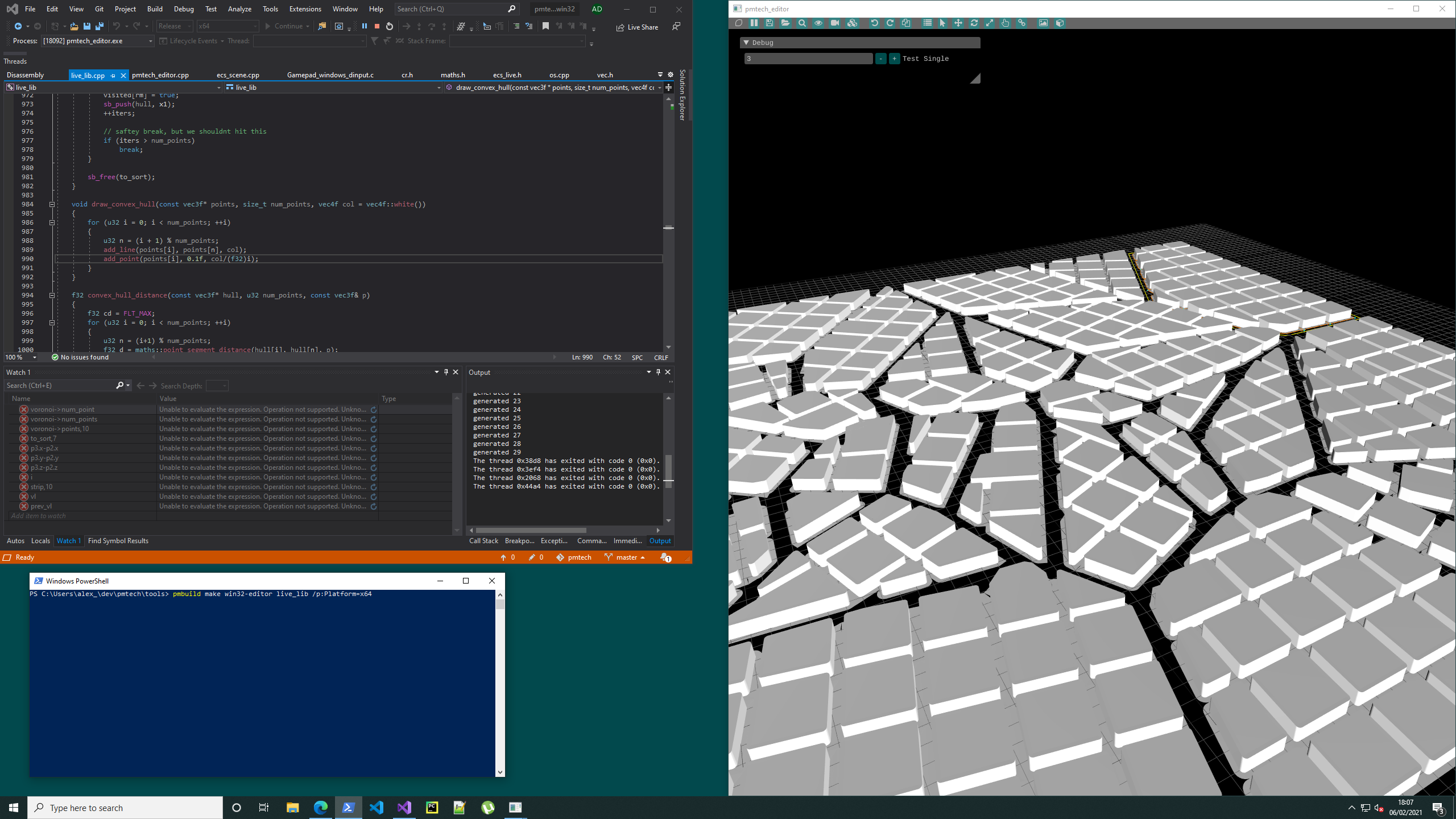 It is not all not all plain sailing… there are sometimes issues where the reloading stops working and requires an app restart. If the host crashes because of bad code in the live lib then recovering from this means building the live lib again so it doesn’t cause a crash and relaunching the host, this process can be a little disruptive while in the middle of debugging or working on something and sometimes you can introduce mutiple crashes which might take multiple failures and attempts to reload. I found Windows so far to be the most unreliable platform, it can start failing much sooner than the others, after a few reloads it can sometimes revert back to linking an older dll version, but I haven’t debugged it in great detail yet.